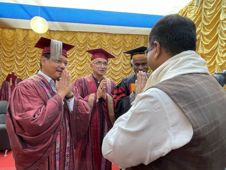 Meanwhile, at the NEHU Convocation event in Shillong, the Meghalaya Chief Minister greets the Union Education Minister.